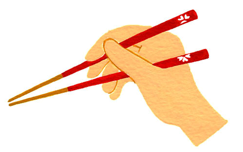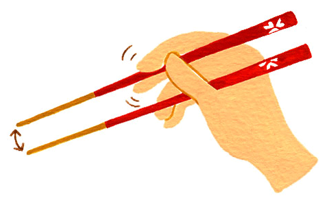 Move only the upper chopstick to pick up food, keep the lower one stationary.